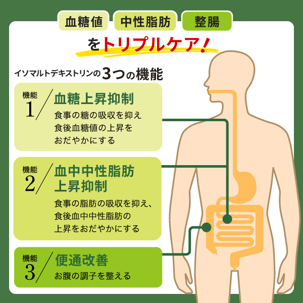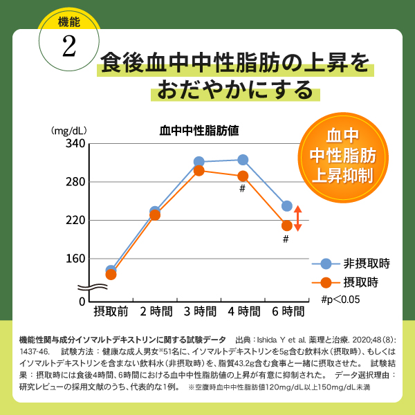 本品に含まれるイソマルトデキストリン(食物繊維)は、食後の血糖値、食後の血中中性脂肪の上昇を抑える機能が報告されています。