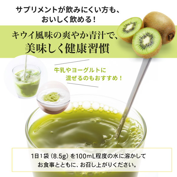 乳酸菌入りのくせのないキウイフルーツ風味だから、スッキリとした美味しさの青汁です。カプセルタイプが苦手な方も飲みやすい!