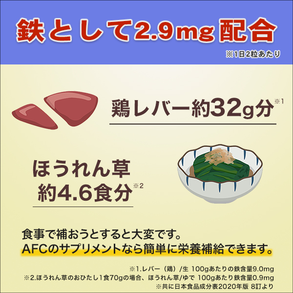AFCのヘム鉄サプリは鉄2.9mg(1日2粒目安)を配合。