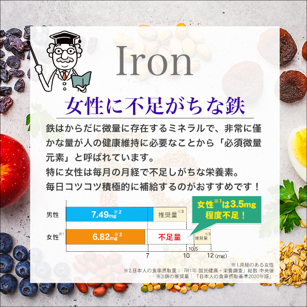 鉄分は、特に女性に不足しがちなミネラル。吸収のよいヘム鉄に、更に鉄やカリウムなどのミネラルやビタミンA・B1などを豊富に含むプルーンを配合しました。