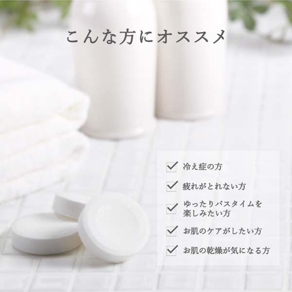 180L〜200Lのお湯に1錠を溶かしてご使用ください。40℃前後のお湯にじっくりと15分以上の入浴をお勧めします。洗髪にもぜひお使いください。