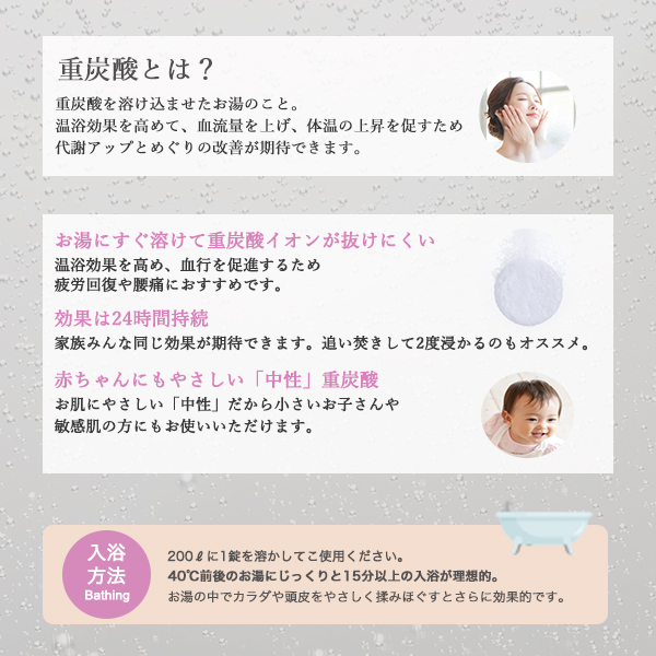 重炭酸温浴法は温浴効果を高めるから、血流を良くし、体の隅々までポカポカにします。冷え性、疲労回復、腰痛などを緩和。 さらに、保湿成分L-アルギニン配合でお肌もしっとり。洗髪にも使用でき、髪や頭皮もうるおいます。