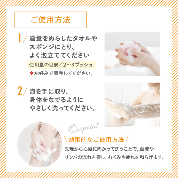 効果的な使用方法:先端から心臓に向かって洗うことで、血液やリンパの流れを促し、むくみや疲れを和らげます。