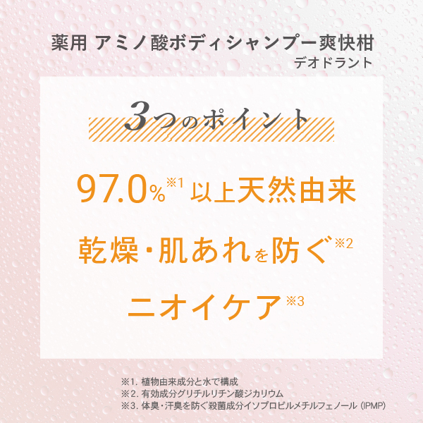 アミノ酸で洗う爽快柑ボディシャンプーの良さはそのままに、保湿成分をさらに増量!うるおう肌への優しさがアップしました。洗っているのにうるおって、まるで美容液をつけたように肌のキメが整います。