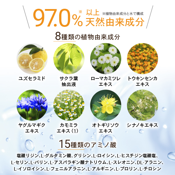 【その他の成分】 精製水、ヤシ油脂肪酸アミドプロピルベタイン液、アルキル(8~16)グルコシド、ポリオキシエチレンセトステアリルヒドロキシミリスチレンエーテル、N-ヤシ油脂肪酸アシル-L-グルタミン酸ナトリウム、ユズセラミド、サクラ葉抽出液、ローマカミツレエキス、トウキンセンカエキス、ヤグルマギクエキス、カモミラエキス(1)、オトギリソウエキス、シナノキエキス、DL-ピロリドンカルボン酸ナトリウム液、アラントイン、タウリン、塩酸リジン、L-グルタミン酸、グリシン、L-ロイシン、L-ヒスチジン塩酸塩、L-セリン、L-バリン、L-アスパラギン酸ナトリウム、L-スレオニン、DL-アラニン、L-イソロイシン、L-フェニルアラニン、L-アルギニン、L-プロリン、L-チロシン、5’-イノシン酸二ナトリウム、5’-グアニル酸二ナトリウム、1,3-ブチレングリコール、エタノール、炭酸ナトリウム、クエン酸、ジエチレントリアミン五酢酸五ナトリウム液、フェノキシエタノール、パラオキシ安息香酸メチル、オレンジ油