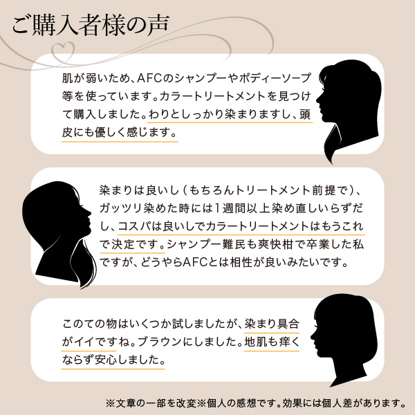 「染まりは良いし(もちろんトリートメント前提で)、ガッツリ染めた時には1週間以上染め直しいらずだし、コスパは良いしでカラートリートメントはもうこれで決定です。シャンプー難民も爽快柑で卒業した私ですが、どうやらAFCとは相性が良いみたいです。」