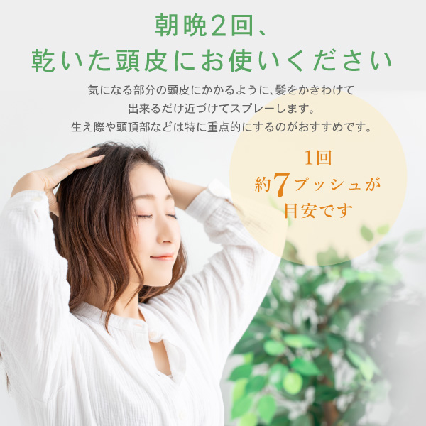 頭皮(シャンプー後は髪を乾かした後)にかかるようスプレーします。頭皮を軽くつまみあげるようマッサージしてください。育毛効果を最大限に実感していただくためには1日2回、就寝前の洗髪後と朝の頭皮が清潔な状態でお使いください。