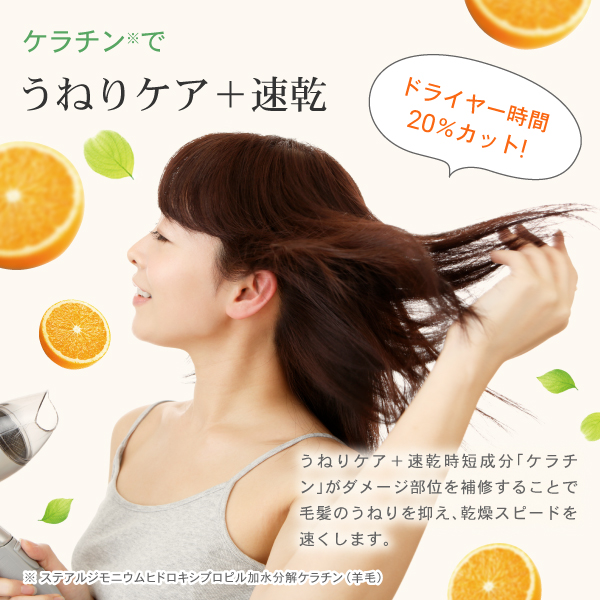 うねりケア+速乾時短成分「ケラチン」がダメージ部位を補修することで毛髪のうねりを抑え、乾燥スピードを速くします。