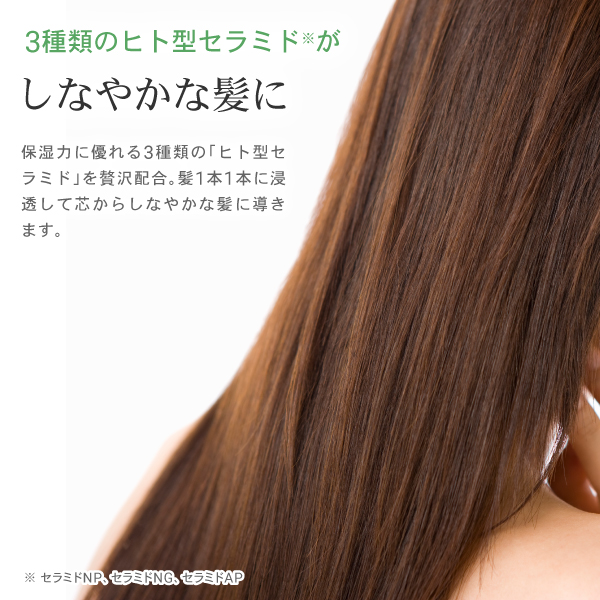 保湿力に優れる3種類の「ヒト型セラミド」を贅沢配合。髪1本1本に浸透して芯からしなやかな髪に導きます。