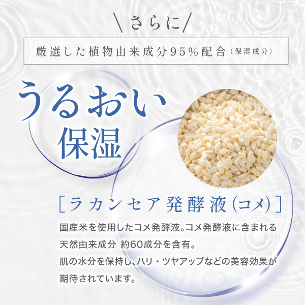 国産米を使用したコメ発酵液。コメ発酵液に含まれる天然由来成分 約60成分を含有。肌の水分を保持し、ハリ・ツヤアップなどの美容効果が期待されています。