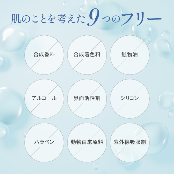 シリコン、合成香料、合成着色料、界面活性剤(サルフェート及び石鹼含む)、鉱物油、アルコール、パラベン、動物由来原料、ケミカル(紫外線吸収剤)