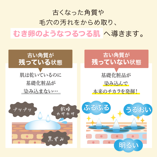 ・洗顔後、適量(2〜3プッシュ)を手にとり、目や唇の周りを避け、気になる部分へ伸ばします。1分程おいてからポロポロが出てくるまでやさしくマッサージしてください。