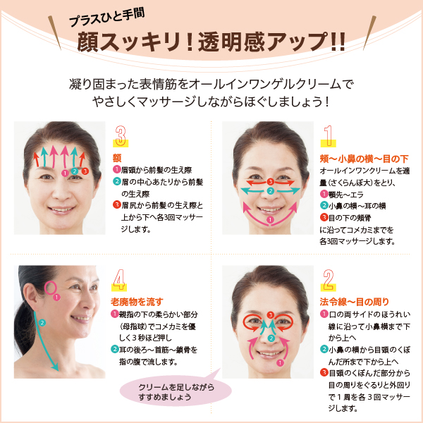 皮膚の薄い目の周辺、ほうれい線、そして顔全体に塗布しましょう。下から持ち上げるように馴染ませていくと成分がより浸透されやすくなります。