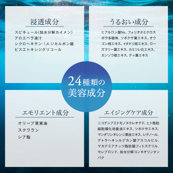 【浸透成分】:スピキュール(加水分解カイメン)、アロエベラ液汁、シクロヘキサン-1,4-ジカルボン酸ビスエトキシジグリコール