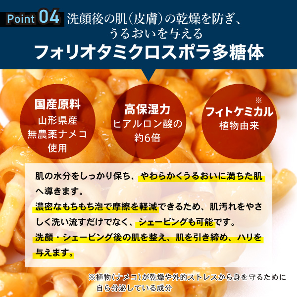 さらに、なめこ由来の高分子多糖体、アミノ酸と10種類の植物エキスも配合。洗い上がりのお肌の水分をしっかりと保持し、やわらかく潤いに満ちたお肌へ導きます。