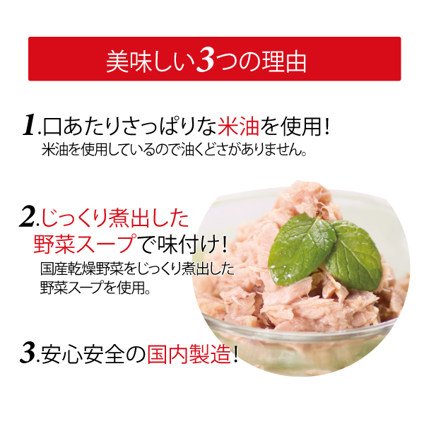まぐろ、米油、野菜スープ(たまねぎ、人参、キャベツ)、ローストオニオン、食塩