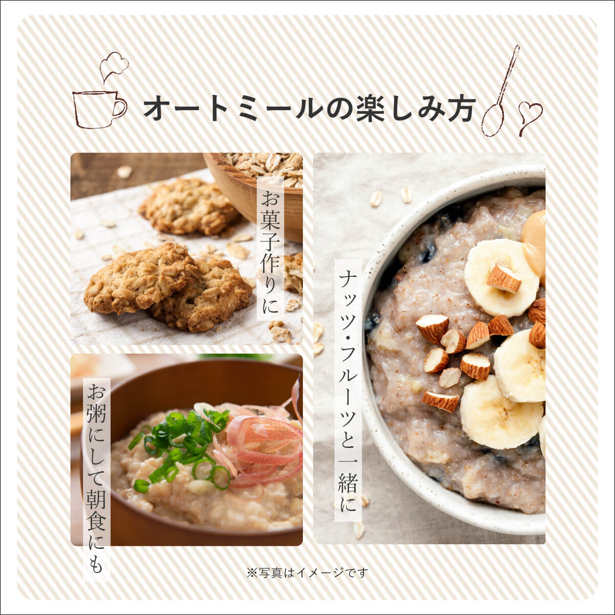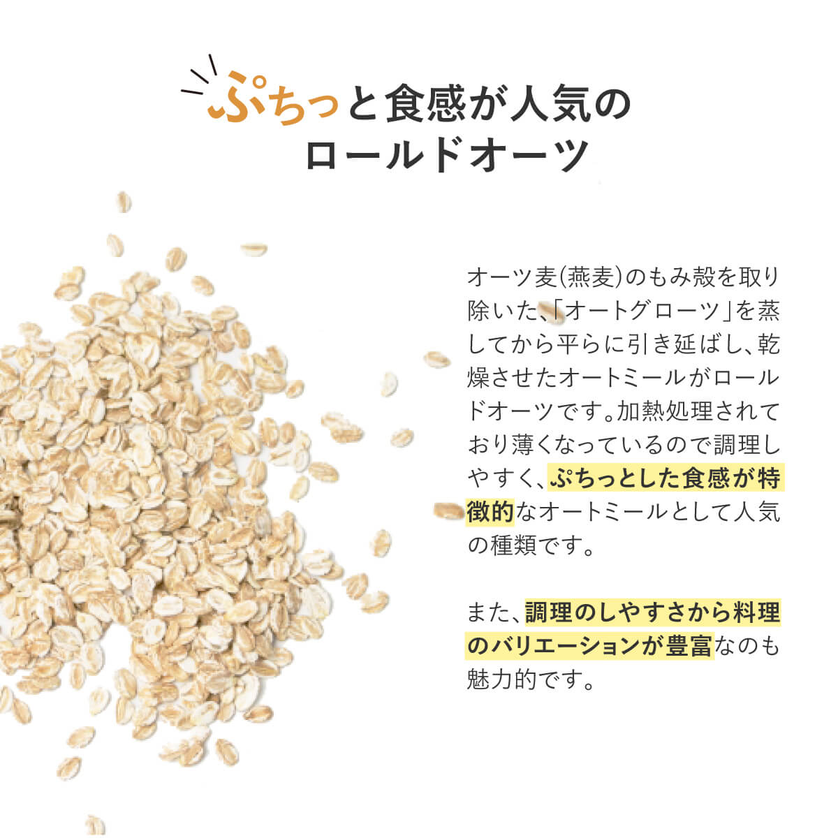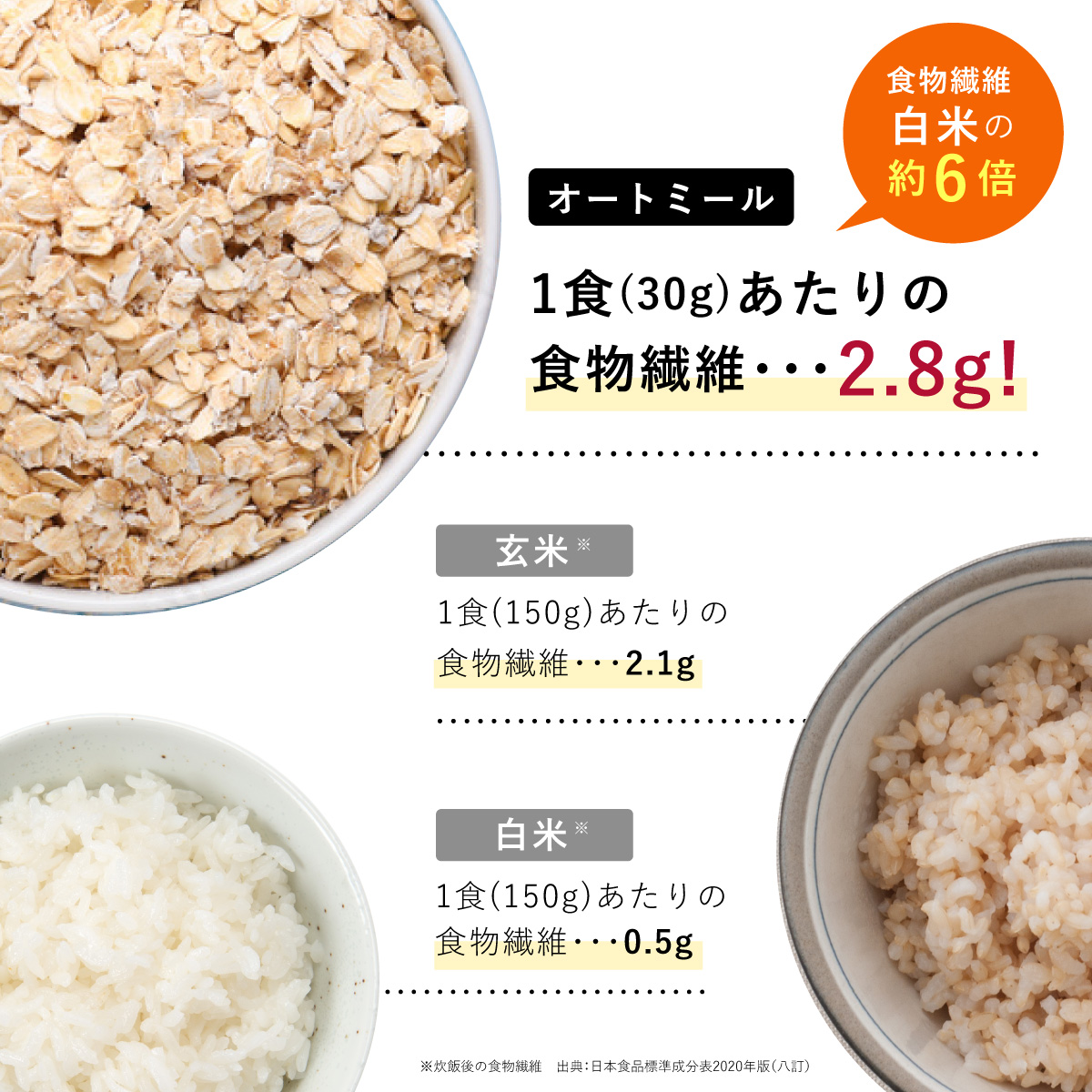 オーツ麦を食べやすく加工したもので、 シリアルのように牛乳やヨーグルトをかけるだけすぐ食べれます。オートミールのGI値(血糖値の上がりやすさ)は穀類の中でもトップクラスに低く、食物繊維も豊富に含まれています。