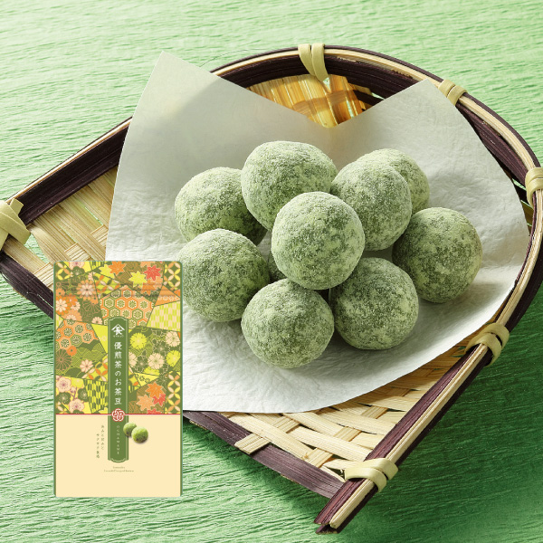 落花生をもち粉と小麦粉のサクサク生地で包み、特別栽培茶「優煎茶」を贅沢にまぶした豆菓子です。優煎茶の豊かな香りと渋みが、お菓子の甘さと絶妙に調和しています。