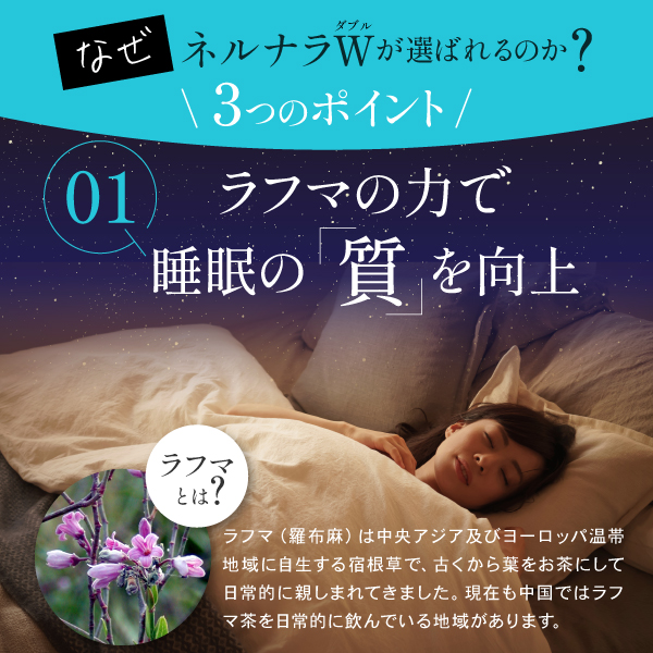 今、注目の「ラフマ」(羅布麻)は古くからお茶としても愛飲されてきた天然ハーブです。 ラフマは、幸せホルモンとも呼ばれる「セロトニン」を増やし、睡眠促進ホルモン「メラトニン」を増やすメカニズムで、睡眠の質(眠りの深さ)を改善する植物由来成分です。さらにGABAも配合。目覚めがすっきりしない人、寝たりない感じがする人におすすめです。